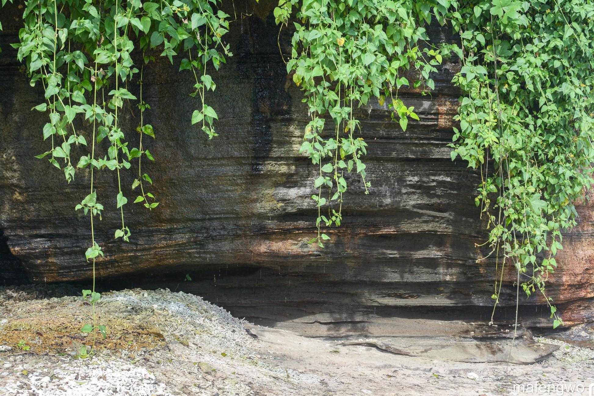 滴水丹屏原名滴水岩,位于涠洲岛西部的滴水村,由岩石形成的悬崖峭壁是典型的海蚀地貌,裸露着的岩层,红、黄、紫、绿、青五色相间,纹理十分清晰,崖顶之上藤树缠绕,红花绿叶倒挂崖头,展现出旖旎多姿的色彩,故称“丹屏”。巨崖岩层上长年涌动着水珠,不断地向崖下滴落,所以取名“滴水”。滴水丹屏的形成堪称是中国火山景观的奇迹。