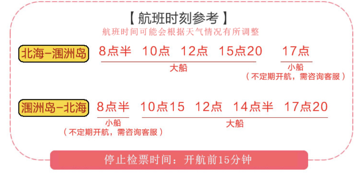 北海到涠洲岛交通:在北海市内乘3路公交车到北海国际客运码头,再乘快船或慢船前往,班次为8:30-17:00,行程1-2小时(会有1-1.5小时浮动,以当时公示为准),船票根据船型约120-180元/人