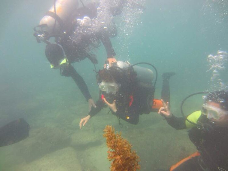 准备好后乘坐艇到海上泊船,直接从船上入水,先由教练培训半小时(培训呼吸、气压处理,以及OK、方向、不舒服、危险4个手势),培训后由教练带领慢慢潜入较深的海底,船潜的海底景色迷人,各种海洋生物丰富,潜入深度一般在10—20米左右。