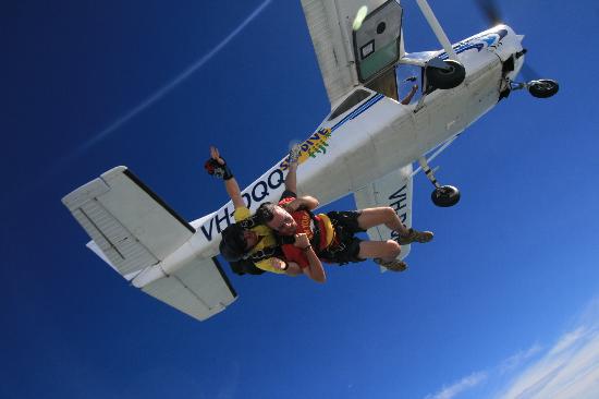 自由落体的时候,请保持香蕉形状(您的头需要往后仰,腿需要往后弯曲,手则需要放在胸前抓住跳伞器具)