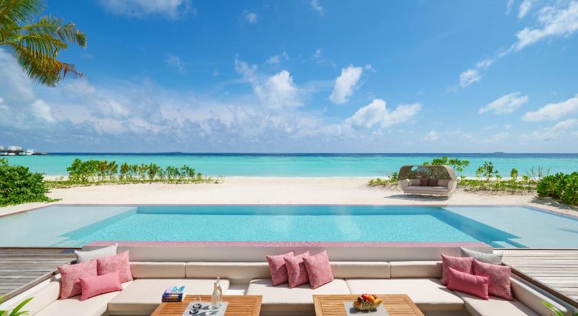 岛屿整体风格非常的罗曼蒂克,打破传统的马代茅草屋风格,少有的现代奢华风,全部都是复式住宅,白色和红粉色搭配,非常的浪漫和美!